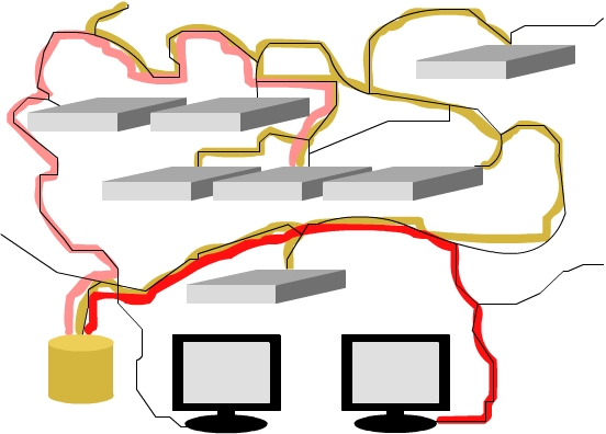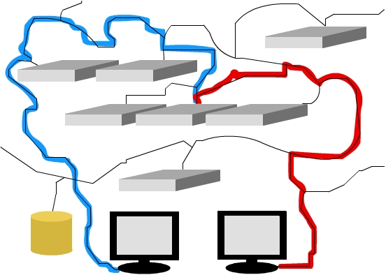Clients (die schwarzen Bildschirme) greifen auf die Server zu. Z.B. kann ein Client über den blauen Weg Daten auf einen Server hochladen. Später kann dann ein anderer Client über den roten Weg diese Daten wieder vom Server abholen.