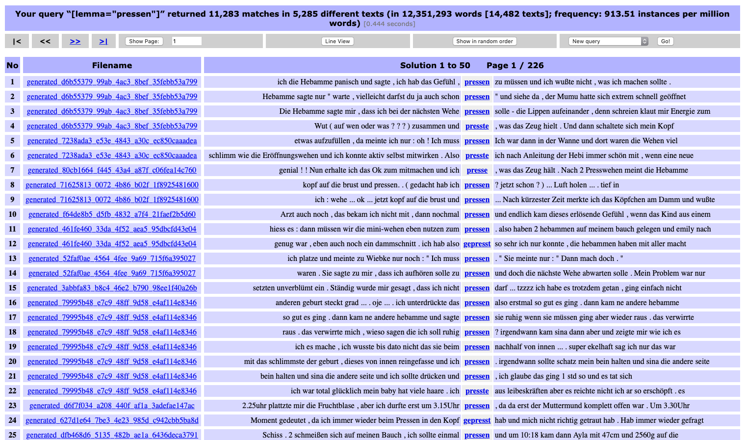 Bubenhofer, Noah (2018): Serialität der Singularität: Korpusanalyse narrativer Muster in Geburtsberichten. In: LiLi Zeitschrift für Literaturwissenschaft und Linguistik. DOI: 10.1007/s41244-018-0096-4.