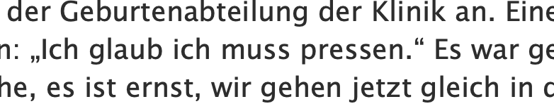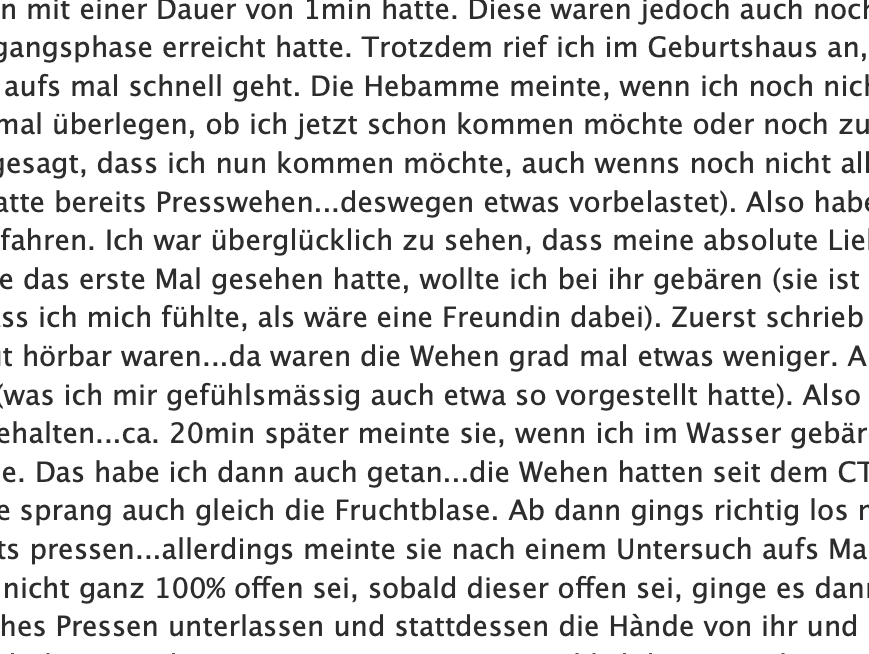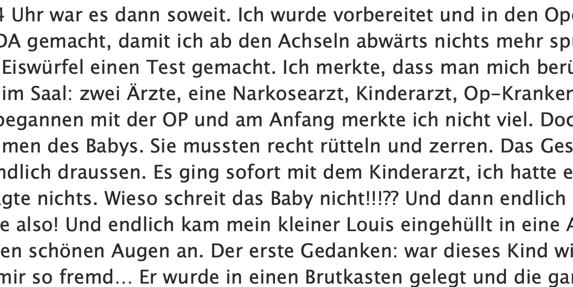 An diesem Tag hatte ich… → …, dass es endlich losgeht → ich hatte das Gefühl, dass… → Mein Mann und ich waren… → war mich sicher, dass… → auf den Weg in die… → Ich sagte ihr, dass… → so heftig, dass ich… → fühlte sich an, als → war ich fix und fertig → Ich hatte das Gefühl, → dass es nicht mehr lange… → ich dachte, ich muss… → , aber es ging nicht → , was das Zeug hielt → dann ging alles ganz schnell → Ich weiß nur noch… → um 16:38 war es → ich konnte es nicht glauben → ich war so froh… → , dass es vorbei war → ich hätte nie gedacht, → und ich muss sagen, → Für mich war es eine… → noch vor sich haben…